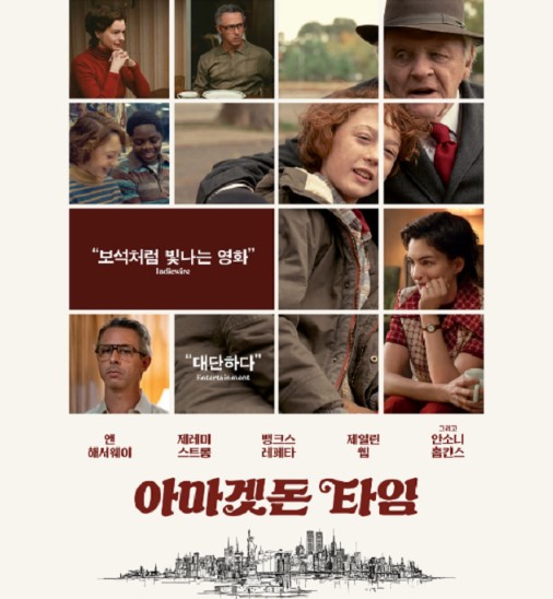 영화 <아마겟돈 타임>은 각본과 연출을 함께 맡은 이민자 출신 제임스 그레이 감독이 자신의 기억 속에 살고 있는 크고 작은 모든 사건들을 진실되게 영화에 담아 놓은 자전적인 작품이다.  <아마겟돈 타임>은 변화의 바람이 불어오던 1980년대 뉴욕 퀸즈에서 한 소년의 성장에 대한 가슴 아프고 사려 깊은 내용을 담은 영화이다.  주인공 폴의 역을 맡은 뱅크스 레페타 아역배우의 화려하고 찬란한 연기를 볼 수 있었다.  그리고 폴의 어머니 에스터 역을 맡은 앤 해서웨이 배우는 어린 아들을 보호하고 자신의 야망도 지키는 여성의 모습을 잘 표현하였다.  또한, 폴의 아버지 어빙 역을 맡은 제레미 스트롱 배우는 책임감이 강하고 무슨 일이 든 지 할 수 있을 것 같은 굵은 연기를 잘 보여줬다.  영화의 중심을 잡아주는 폴의 할아버지 애런 역을 맡은 앤서니 홉킨스 배우는 손자 폴에게 다정한 할아버지의 모습을 연기하며 따뜻함을 잘 전달하였다.  그리고 주인공 폴의 둘도 없는 친구 죠니 역을 맡은 제일린 웹 아역배우도 주인공 폴 역을 맡은 벵크스 레페타 아역 배우와 호흡을 잘 맞추어 살아 있는 연기를 보여 관객들의 호응을 잘 끌어냈다.
